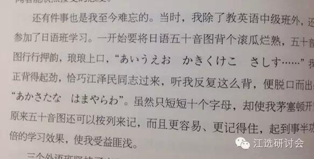 成为总书记后,一次江参观中央台对外日语演播室,对工作人员说了句日语,意为「我也多少知道点日语的」,访日时江也多次用日语进行日常交流。